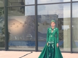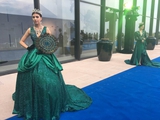 - 外籍模特身穿墨绿色礼服,与龙湖品牌主题色彩相得益彰,深沉大气。