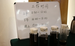 - 信网看到,长桌上除了放置工作时间白板,还摆了四壶姜茶。提案组工作人员孙珮琳称,从大会开始前两天,提案组的工作人员就已经提前进驻到会场,熟悉工作。因天气较冷和长时间呆在密闭的房间审查提案,很多工作人员已经感冒,戴着口罩带病工作。为此,提案组的办公地点不得不喷洒了醋,准备了姜茶进行防御。